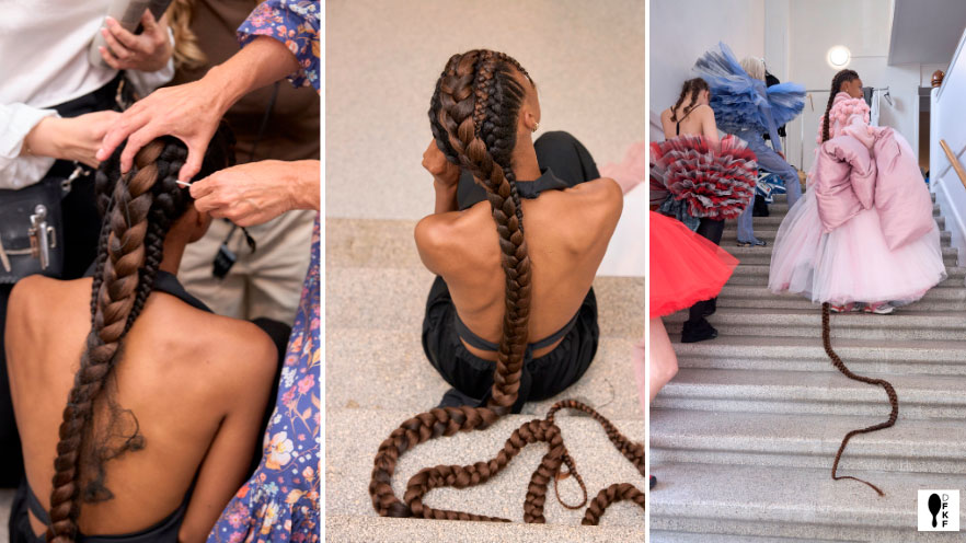 Marianne fortæller: “Først brugte vi KMS THERMASHAPE for at lave heat protection. Derefter lavede vi to klassiske, hollandske fletninger i modellens eget hår, og så syede vi en stor fletning af kunstigt hår i midten mellem de to hollandske fletninger. Den store fletning i midten var lavet med tre forskellige farver: sortbrun, brun og så en kastanjebrun. Det skal svinge i farverne, men ikke for meget. Arbejdet med at lægge fletningen ind krævede 4 hænder, fordi man er nødt til at sortere håret sammen. Vi syede det på med elastiktråd ved at åbne i den ene ende og lave nogle fletninger for så at lægge den store mellem og sy fast mellem de to mindre udvendige. Til sidst brugte vi KMS HAIRSTAY (og det lever den op til). Så spankulerede Lande ind med 4 meter langt hår, hvilket var virkelig sjovt.”